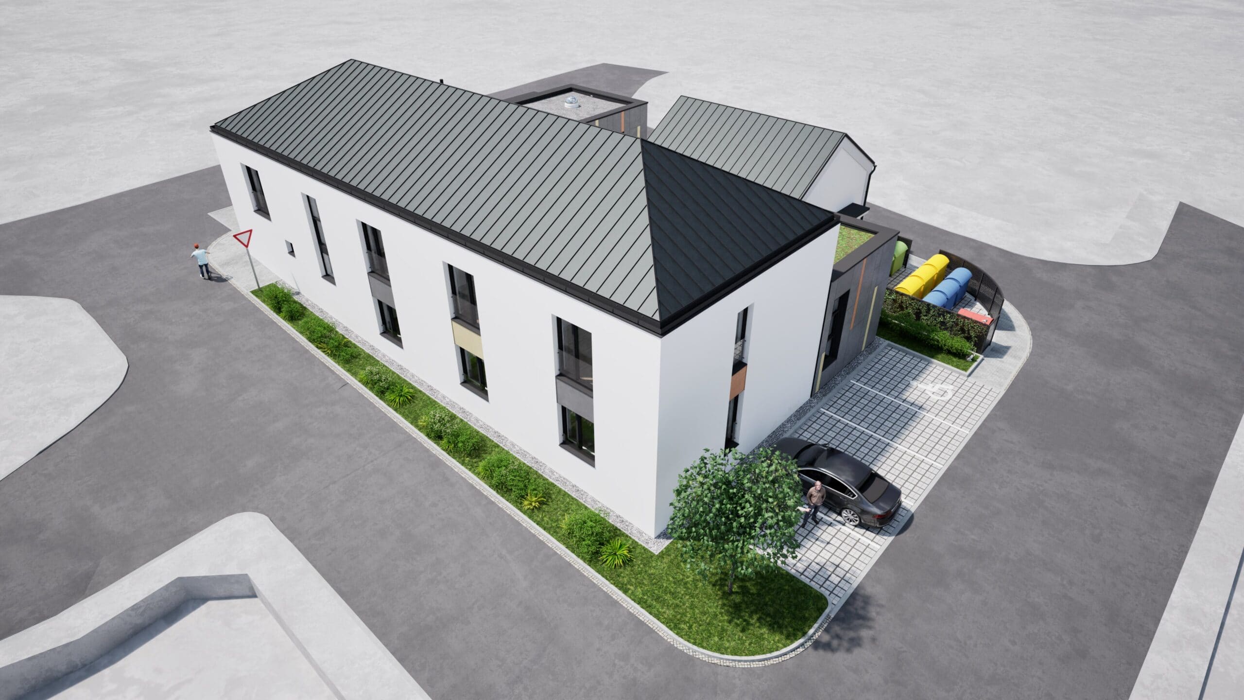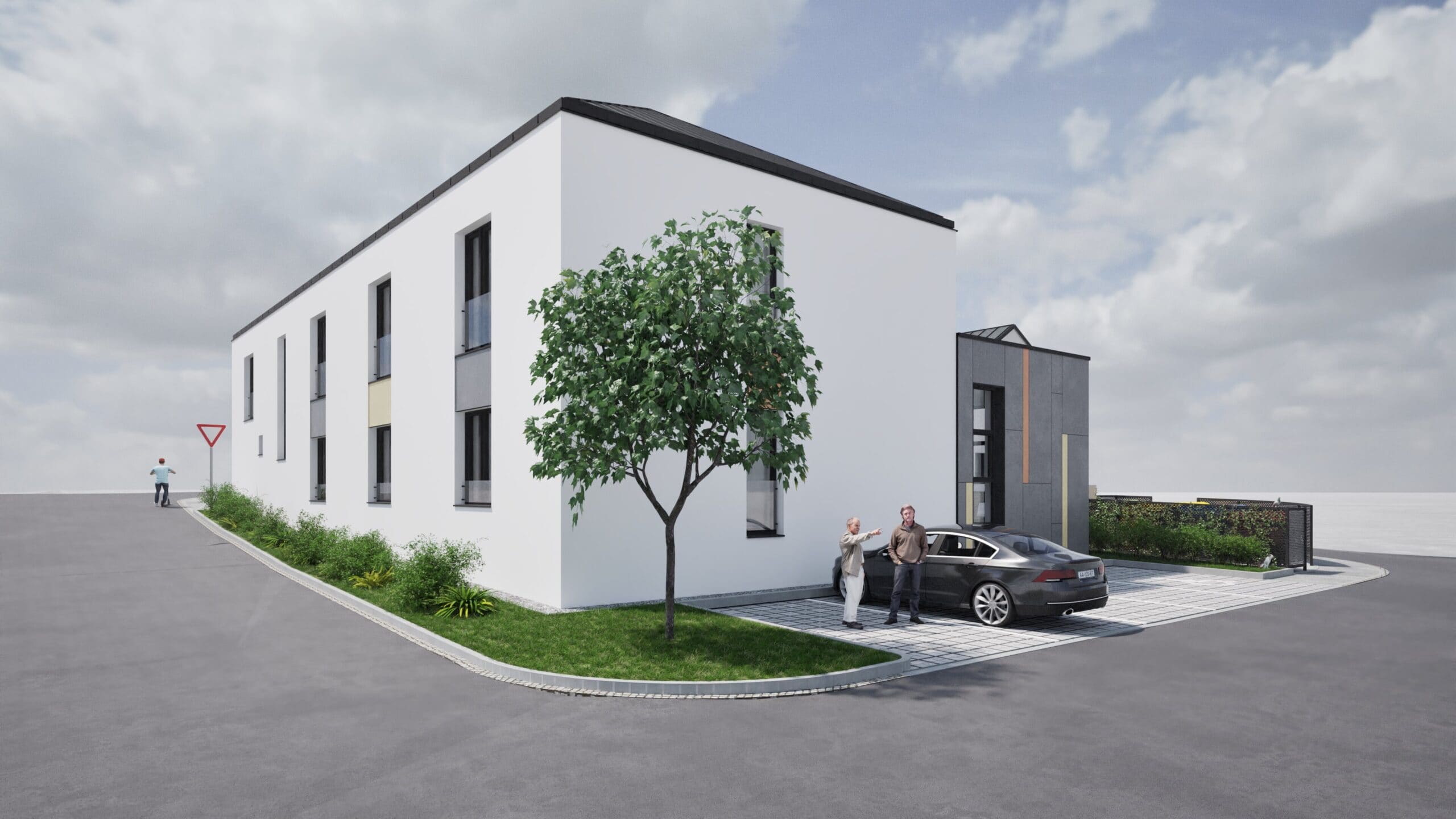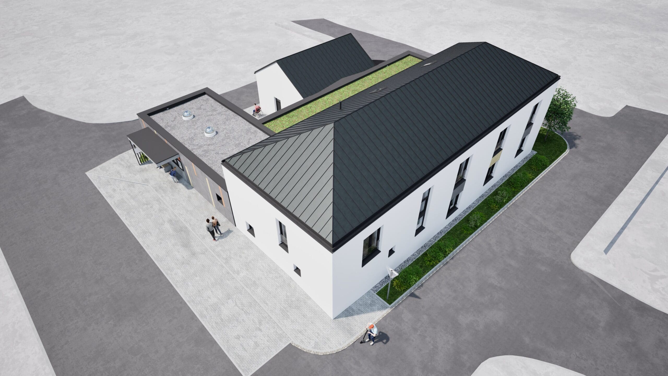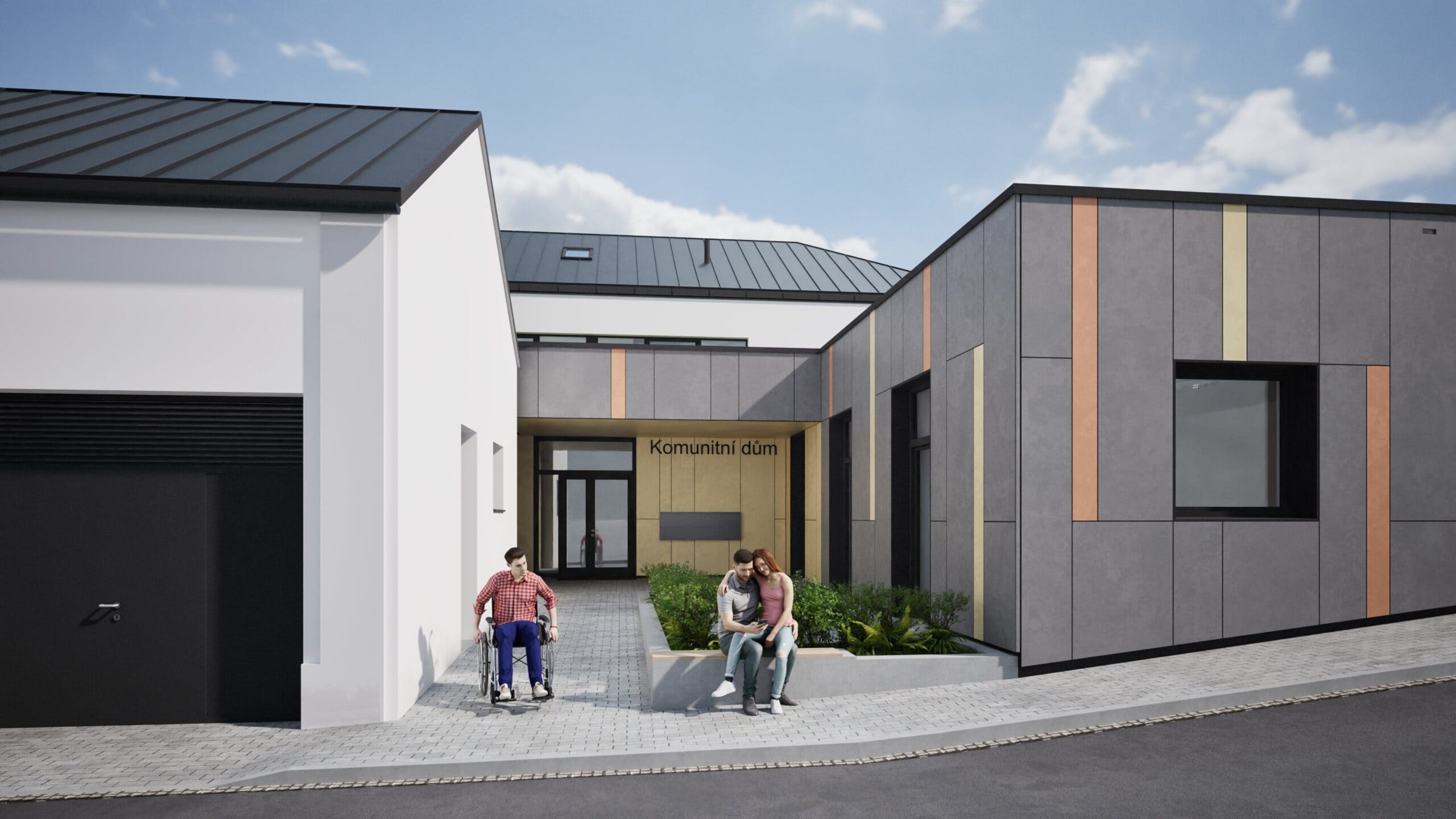 Komunitní dům se nachází v centrální části obce, nově navržená přestavba kopíruje hranici původního objektu, pouze na SV straně ustupuje dovnitř původní zastavěné plochy. V rámci přestavby je řešen bezbariérový komunitní dům s možností podporovaného bydlení, včetně příslušného zázemí o celkovém počtu 8 bytových jednotek. Je navržena dvoupodlažní nepodsklepená stavba s valbovou střechou nad dvoupodlažní částí a plochou střechou nad jednopodlažní částí. V 1.NP jsou navrženy 4 samostatné bytové jednotky a zázemí se společenskou částí, ve 2.NP jsou navrženy další 4 bytové jednotky. Měřítko stavby, odpovídá okolní zástavbě. Komunitní dům je řešen v současném duchu, použité materiály navržené na fasádách objektu jsou současné standardní materiály: tenkovrstvá jemnozrnná omítka kontaktního zateplovacího systému, provětrávaná fasáda z cementovláknitých desek s přirozenou strukturou v odstínu střední šedé s barevným akcentem probarvených desek v odstínech světle žluté a světlé červené, což odkazuje na obecní barvy znaku obce Křelov – Břuchotín.