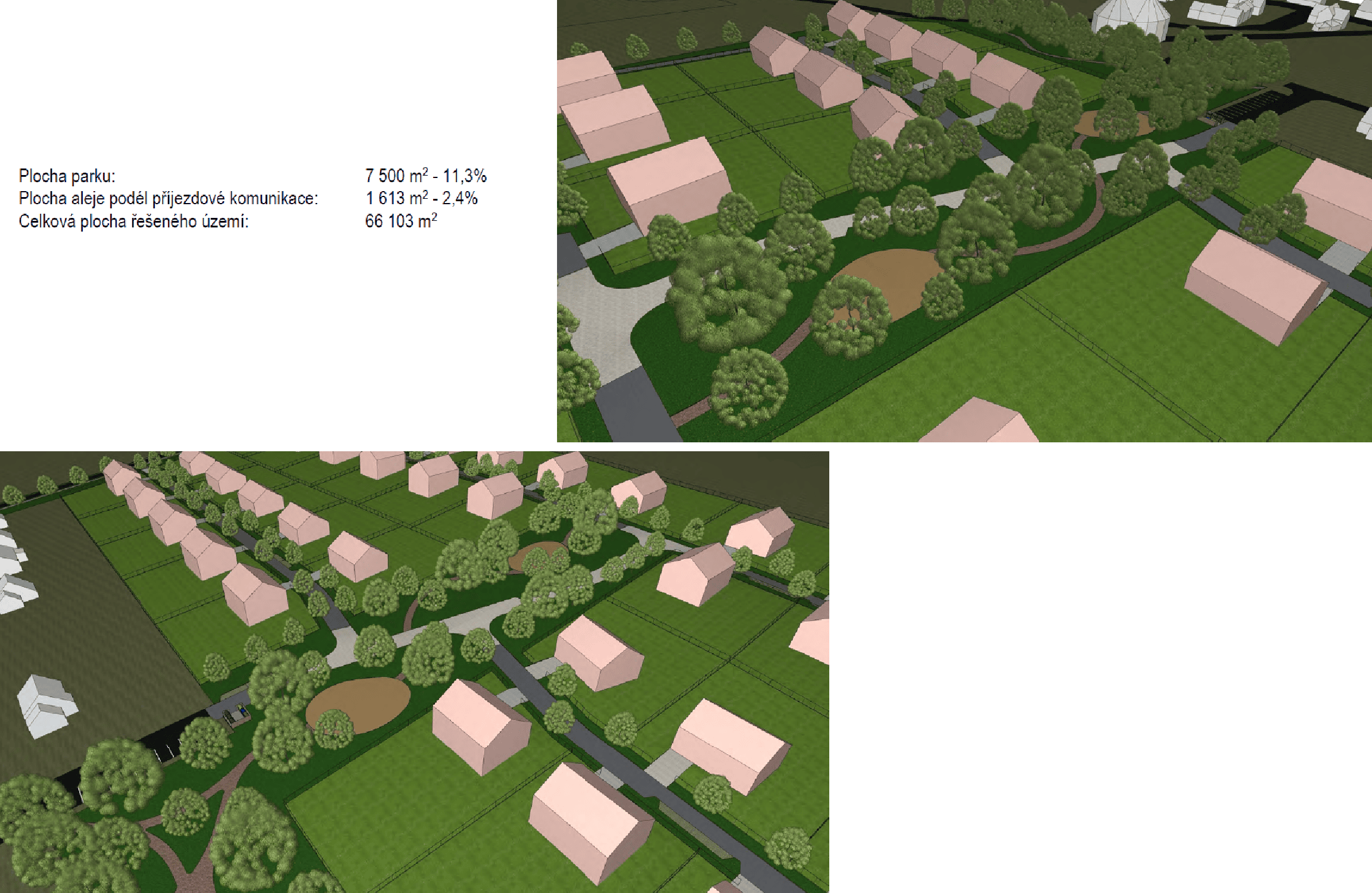 Řešená oblast je navržena jako obytná zóna. Za tímto účelem bude vozovka lokálně zúžena zelenými ostrůvky s parkovacími stáními. Za vjezdovými křižovatkami budou umístěny zpomalovací prahy. Celá délka komunikace procházející parkem bude řešena jako zvýšená.